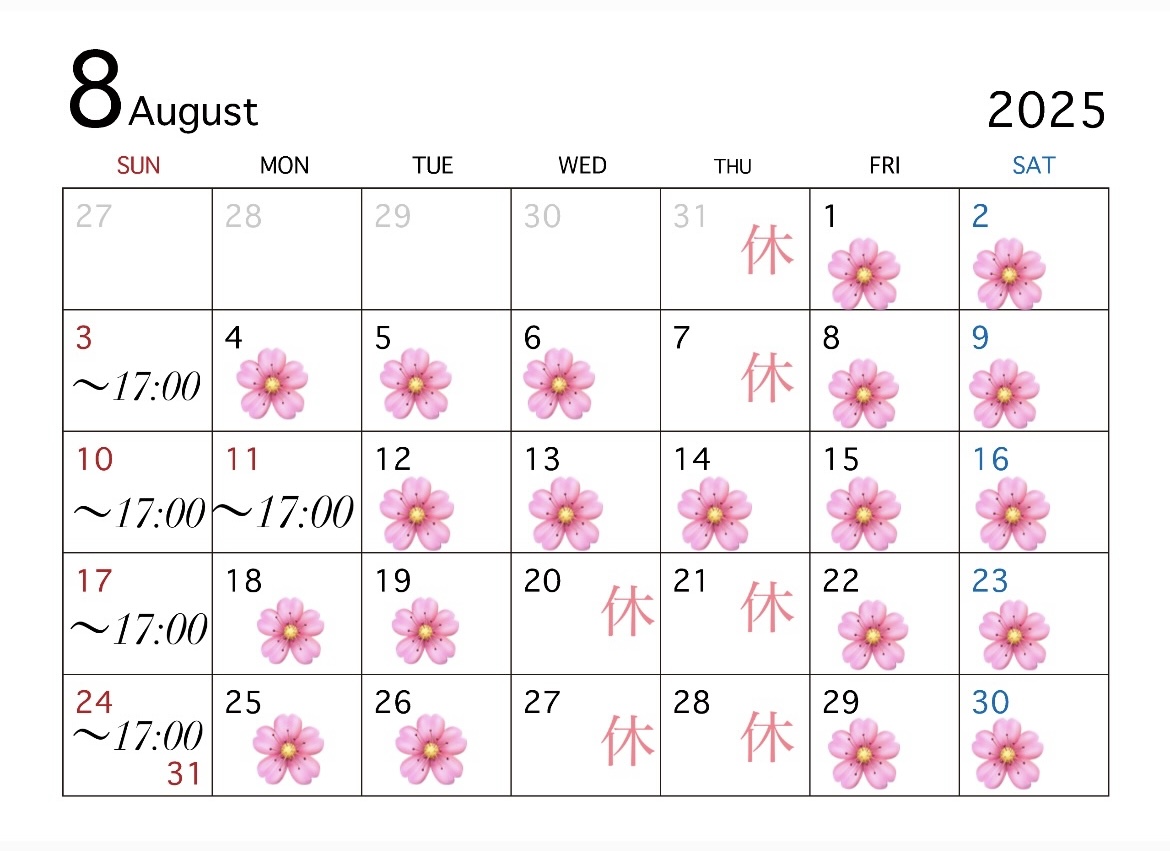 8月の営業日程です(^^)